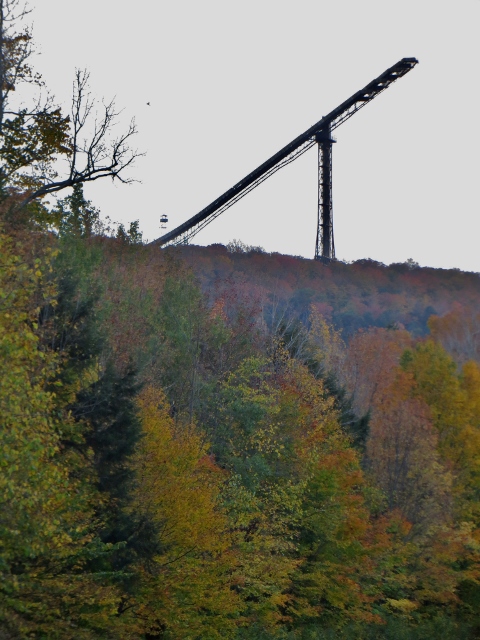 Bob is coming down the narrow wooden stairs on the left. The benches in the center of the photo are where the ski fliers sit before they slide over to go down the ramp.